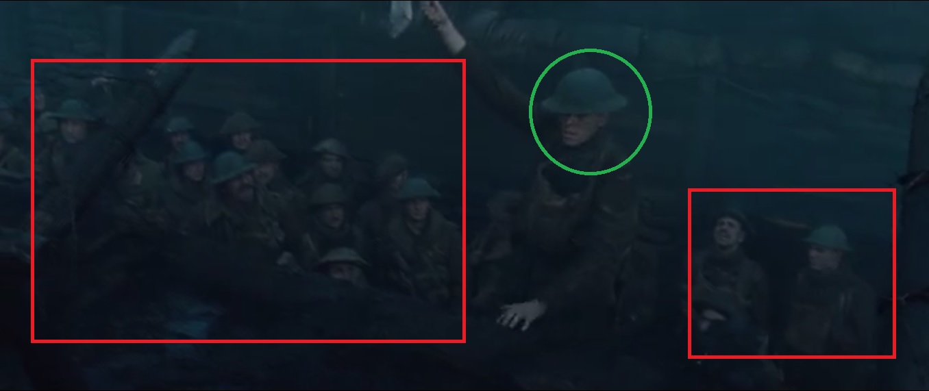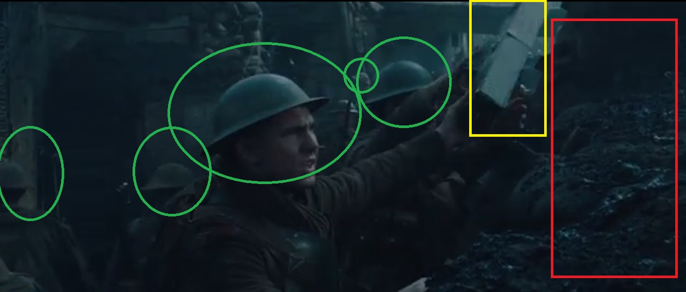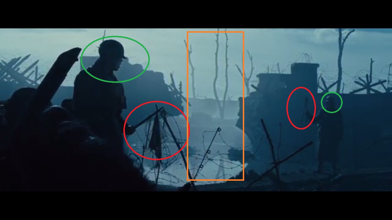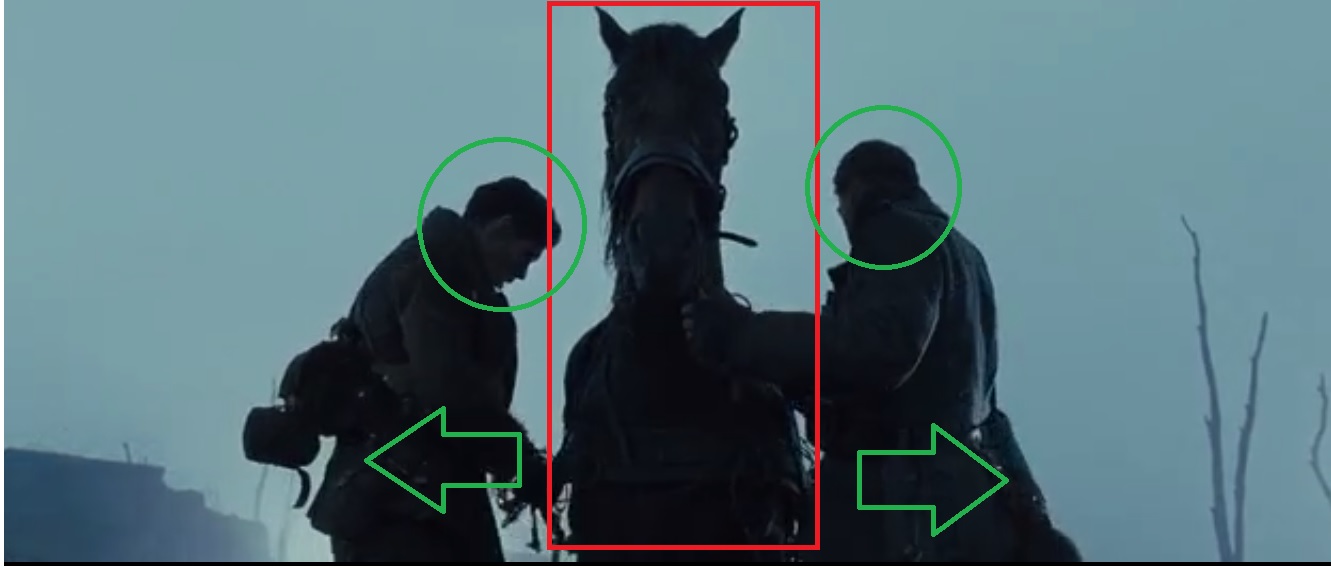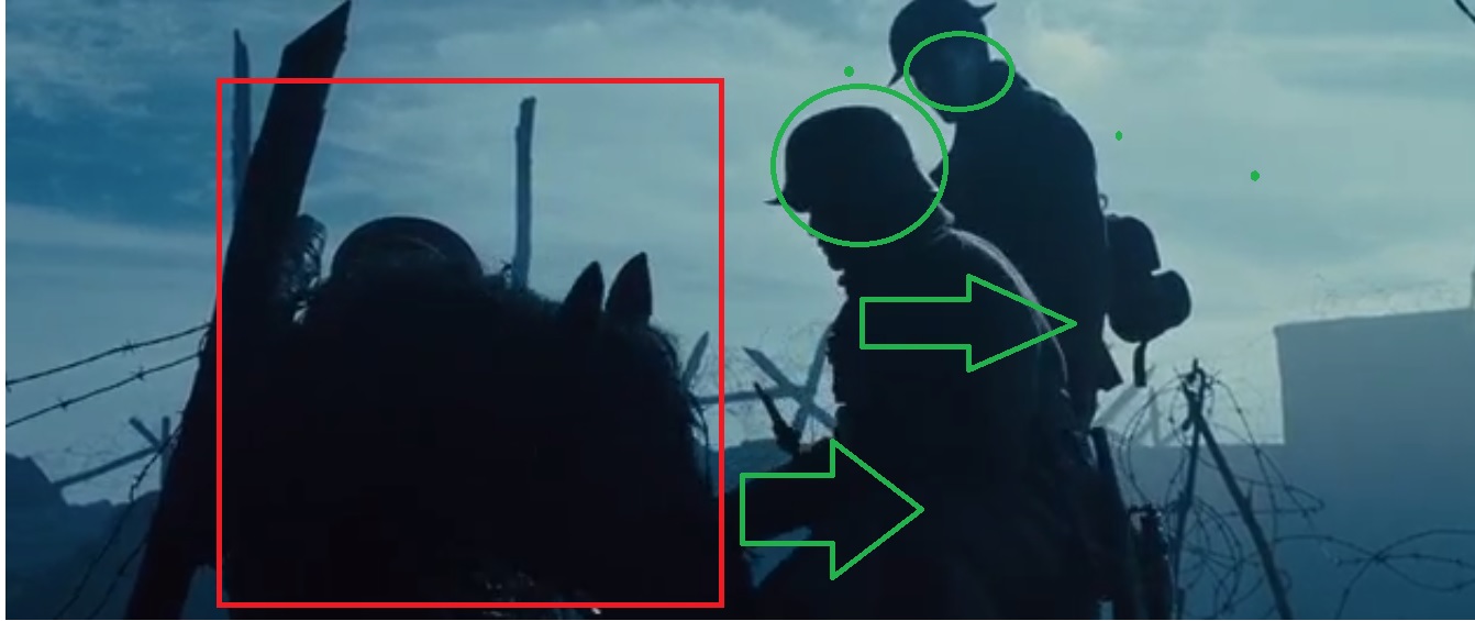 But … If English and German are needed … How will we show them to the viewer? Well, very easy. First, we show that it is German and his cowardly companions who have instruments in their trenches to break the cables that injure the horse, and then we begin, not only to place them on the same side of the river or the wounded horse but even crouched (position of vulnerability at war) or without helmets.